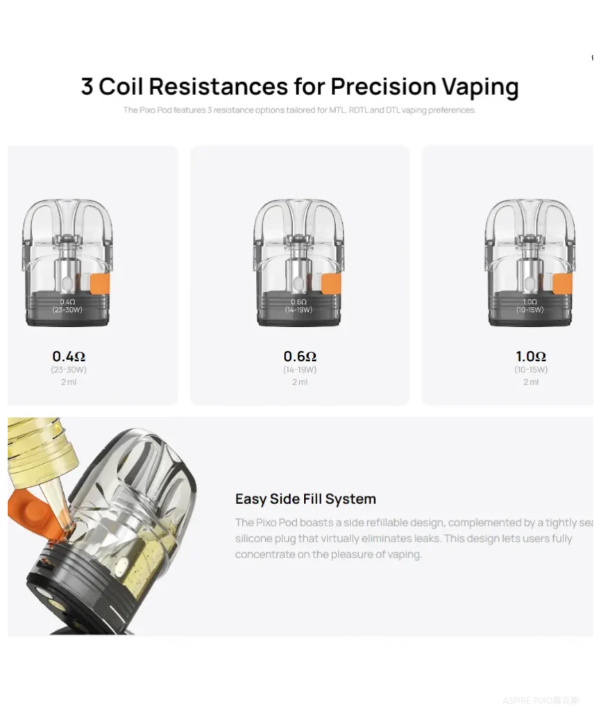 ASPIRE PIXO Cartridge 採用最新的防漏設計技術,搭配 TPD 認證的頂部加油系統,讓每次使用都能體驗到無與倫比的穩定性與方便性。